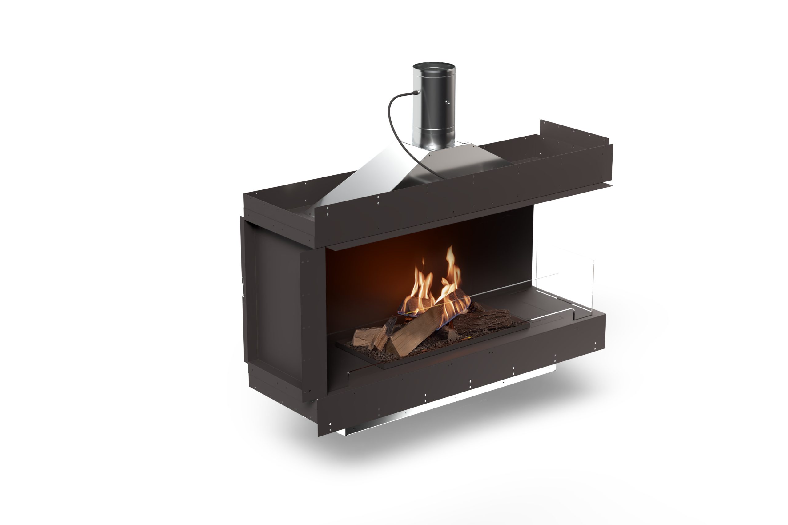 Diese Konstruktion erlaubt die vollständige Integration des Kamins in Wände, Möbelelemente oder architektonische Strukturen — auch in Konfigurationen, bei denen ein TV-Gerät in unmittelbarer Nähe des Feuerraums platziert ist.