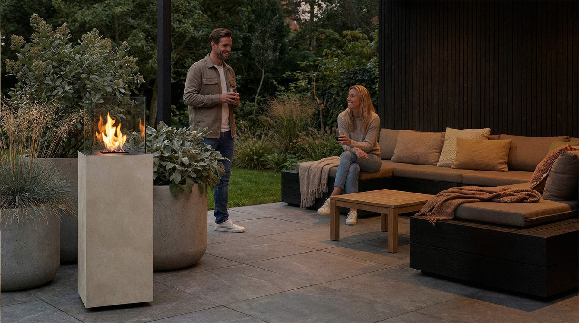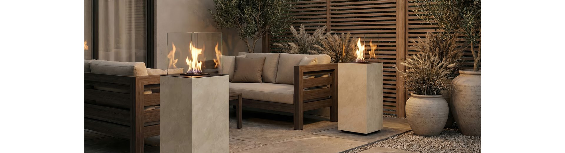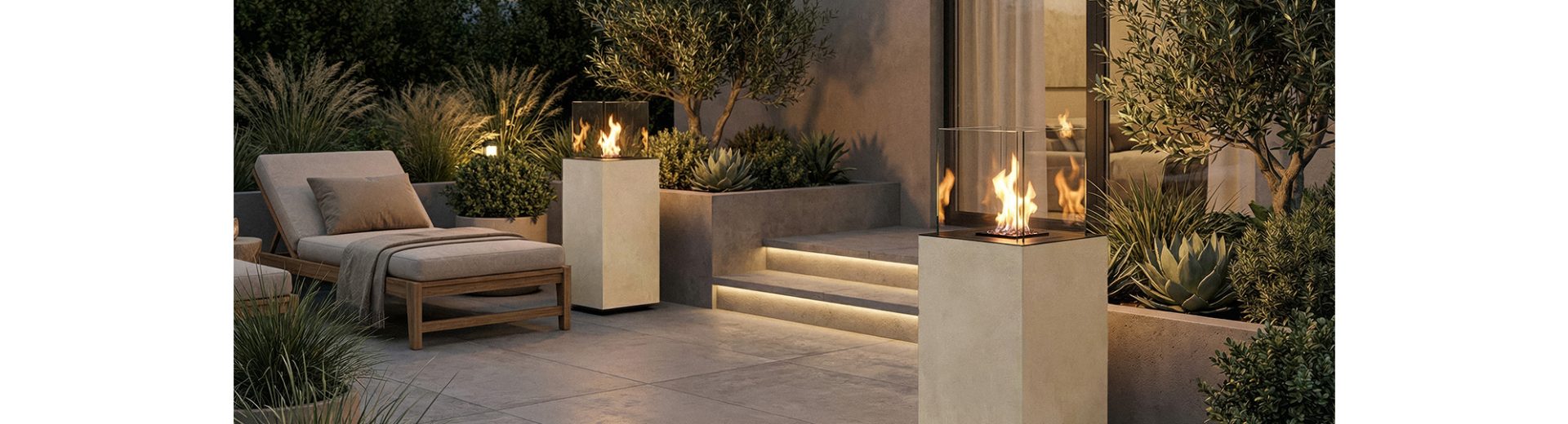 FREISTEHENDER BIERKAMINDie allererste BEV-Feuerstelle für den Außenbereich. Eine Alternative zu Gaskaminen in Gärten, Terrassen, Hotels oder Restaurants. Die unkonventionellen Verkleidungsoptionen von Cosentino – Nacre, Daze, Laurent & Kreta – verleihen der Umgebung einen luxuriösen Touch.