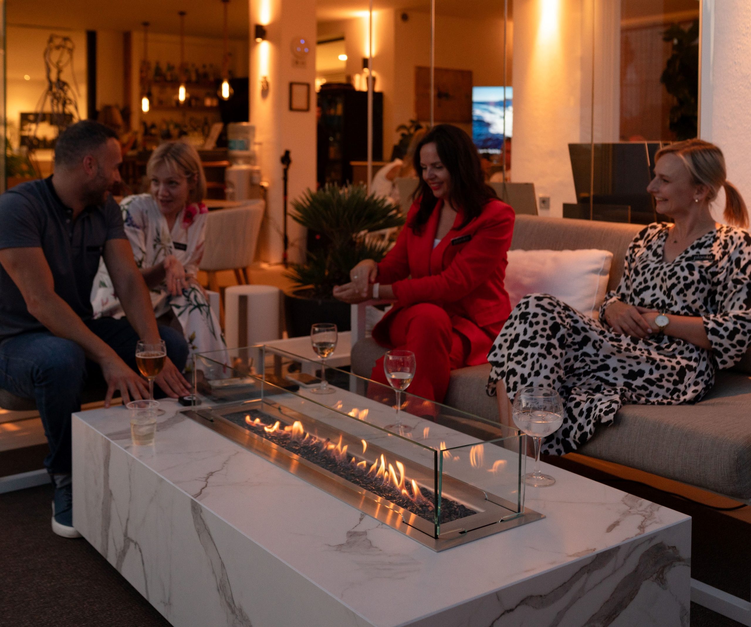 Niedrigere Feuerstellen mit einer Höhe von etwa 400 mm sind auf effektive Strahlungswärme ausgelegt und eignen sich ideal für Sitzbereiche und die unmittelbare Interaktion. Cabo Table ist ein fertiges Möbelobjekt, gestaltet als monolithischer, skulpturaler Block mit echtem Feuer. Dezent integrierte Rollen sorgen für Mobilität, während das automatische Nachfüllsystem Zeit- und Wartungsaufwand reduziert. Höhere Modelle mit integrierten Glasscheiben setzen stärker auf visuelle Wirkung und Lichtreflexion und dienen primär der Atmosphäre. Das Modell Porto ist eine tragbare, abgasfreie Feuerlösung, die dank sauberer Verbrennung und hochwertiger Verarbeitung sowohl im Innen- als auch im Außenbereich eingesetzt werden kann.